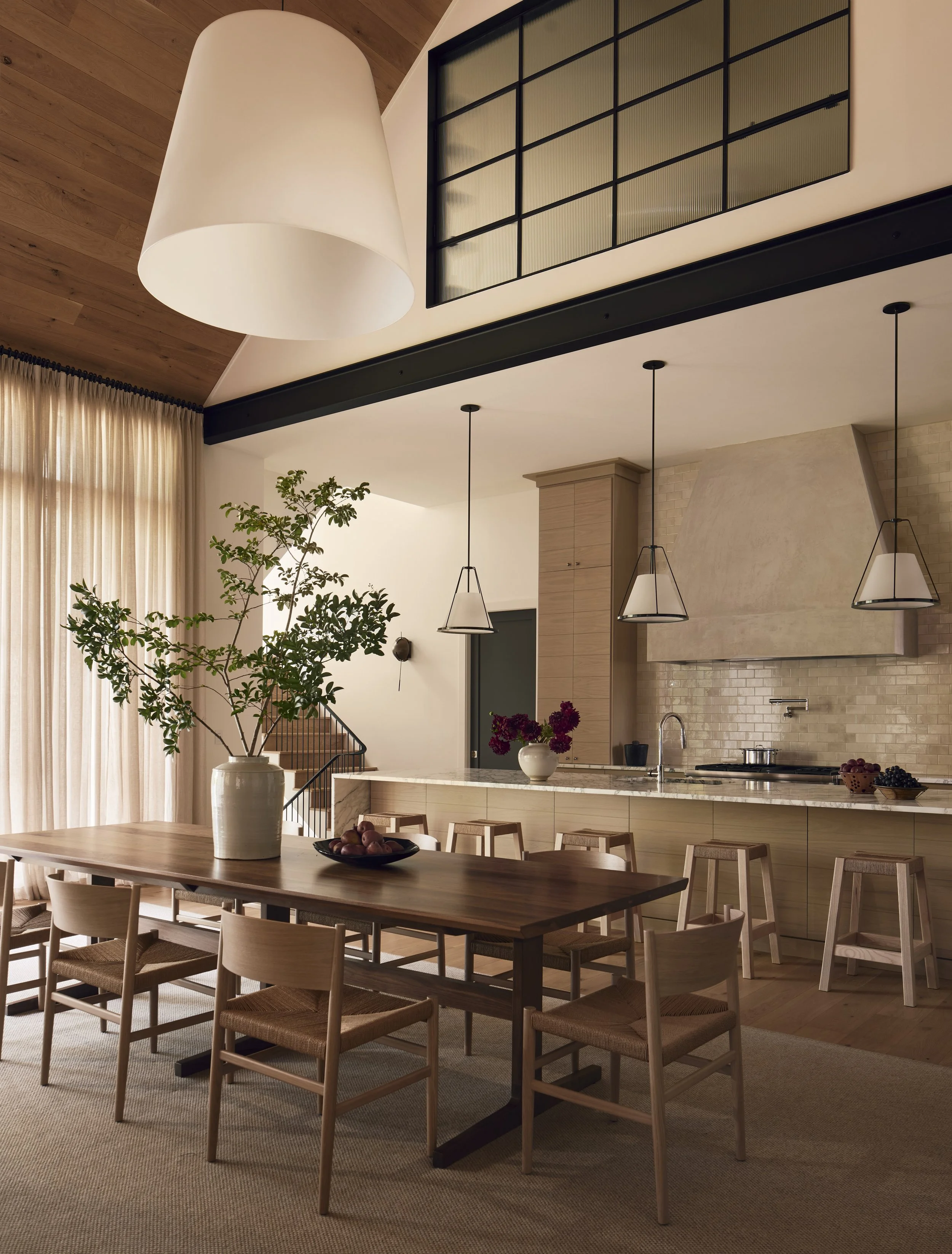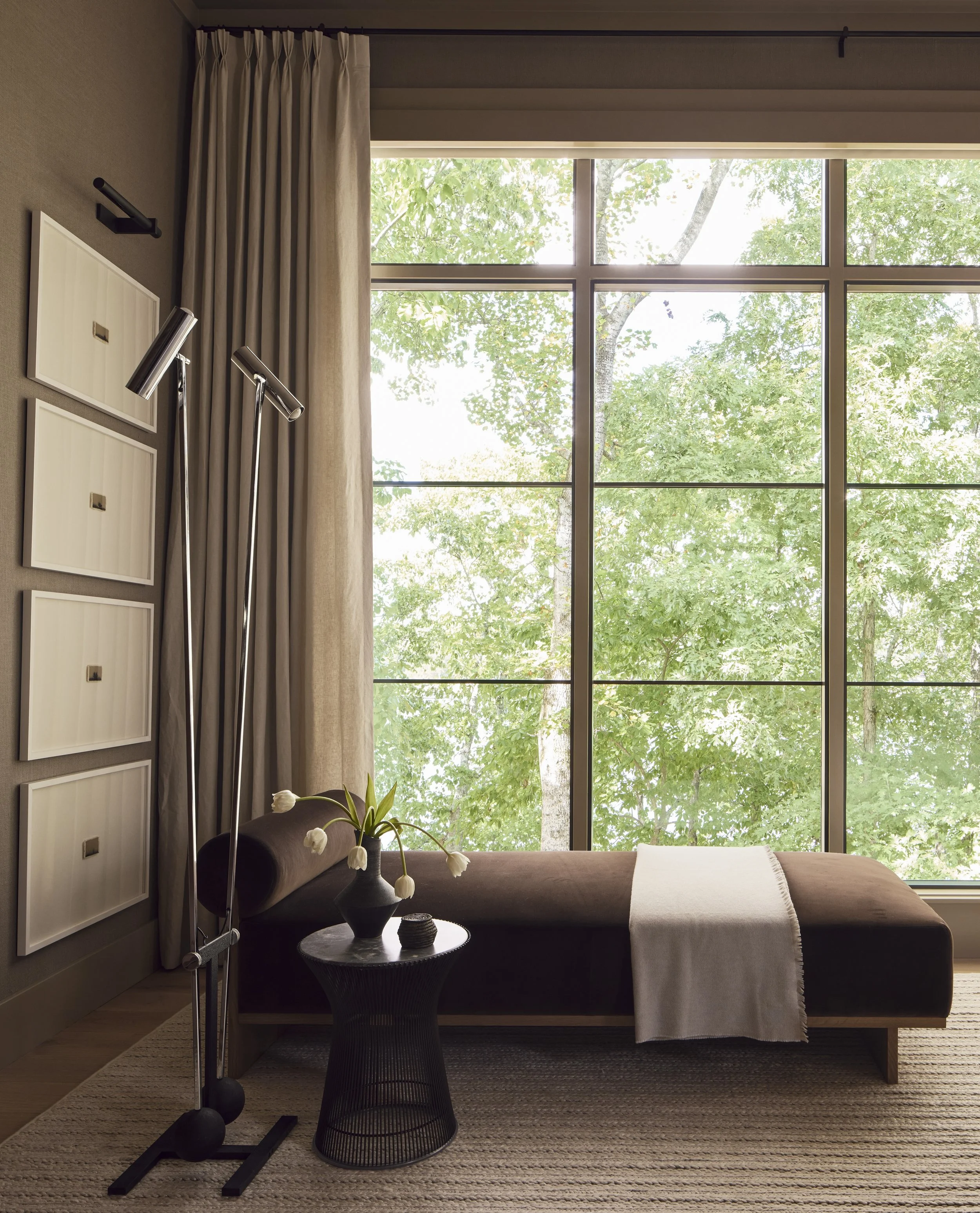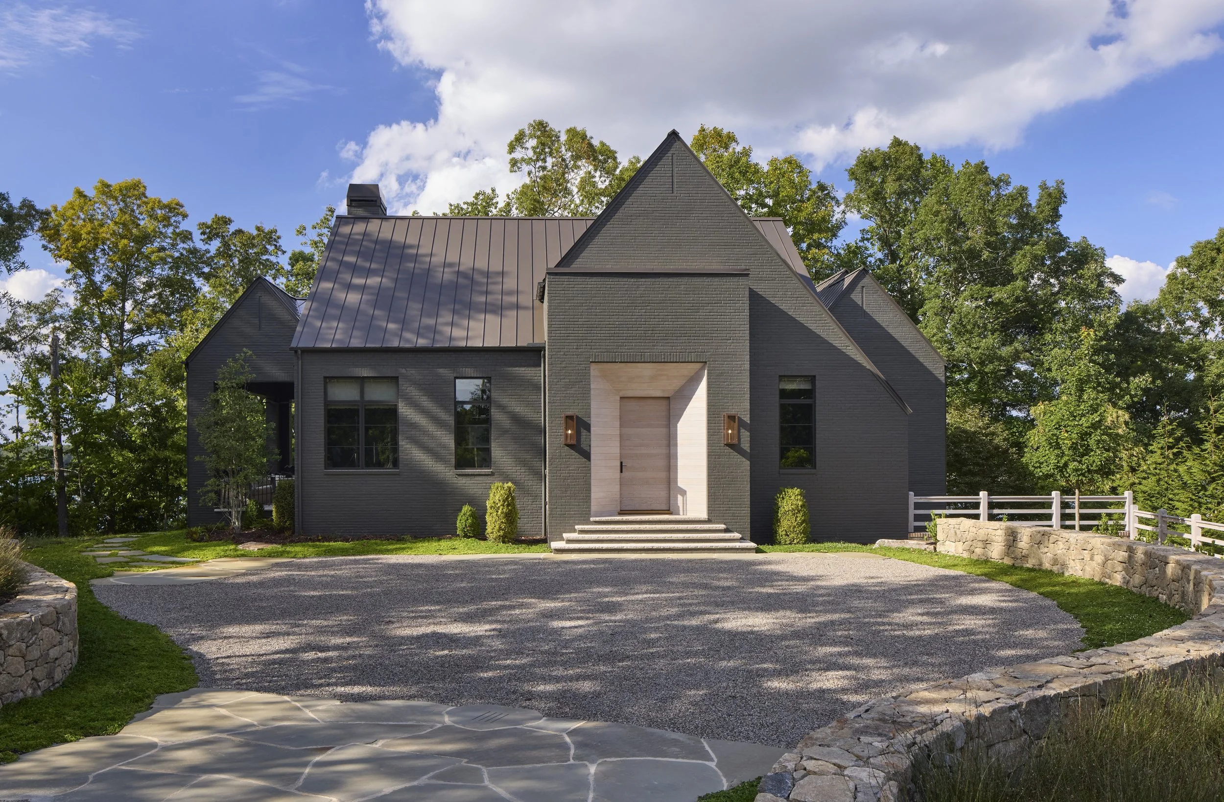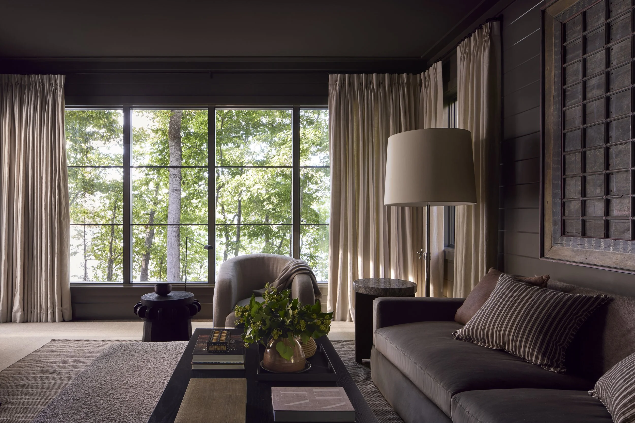 Located on a wooded lakefront lot in Hartwell, Georgia, this newly constructed home offers a modern take on the classic lake cabin. A rich interior palette, featuring European oak, native tumbled stone, blackened steel, and boldly veined marble sets a warm, textural backdrop for contemporary, tailored furnishings and lighting. Published in Luxe Southeast.